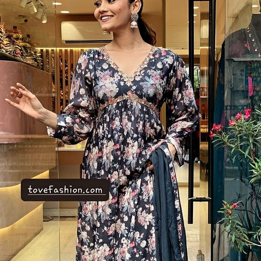 Party wear Suit with Embroidered Yoke with Cutdana, Sequins and Pearls Handwork