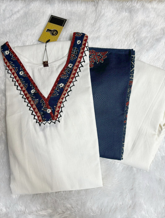 PURE MUL COTTON THREE PIECE SUIT WITH BEAUTIFUL KAMTHI NECKLINE AND BLOCK PRINTED DUPATTA