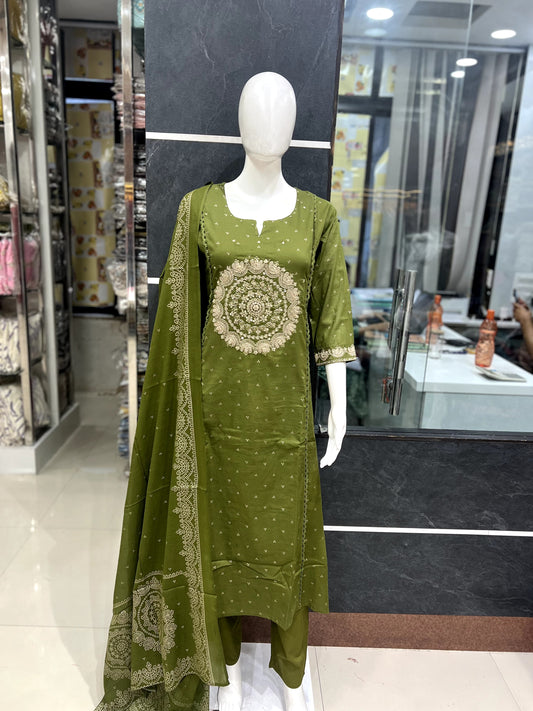 A1725 Mul Cotton Designer Suit (Mehandi Green)