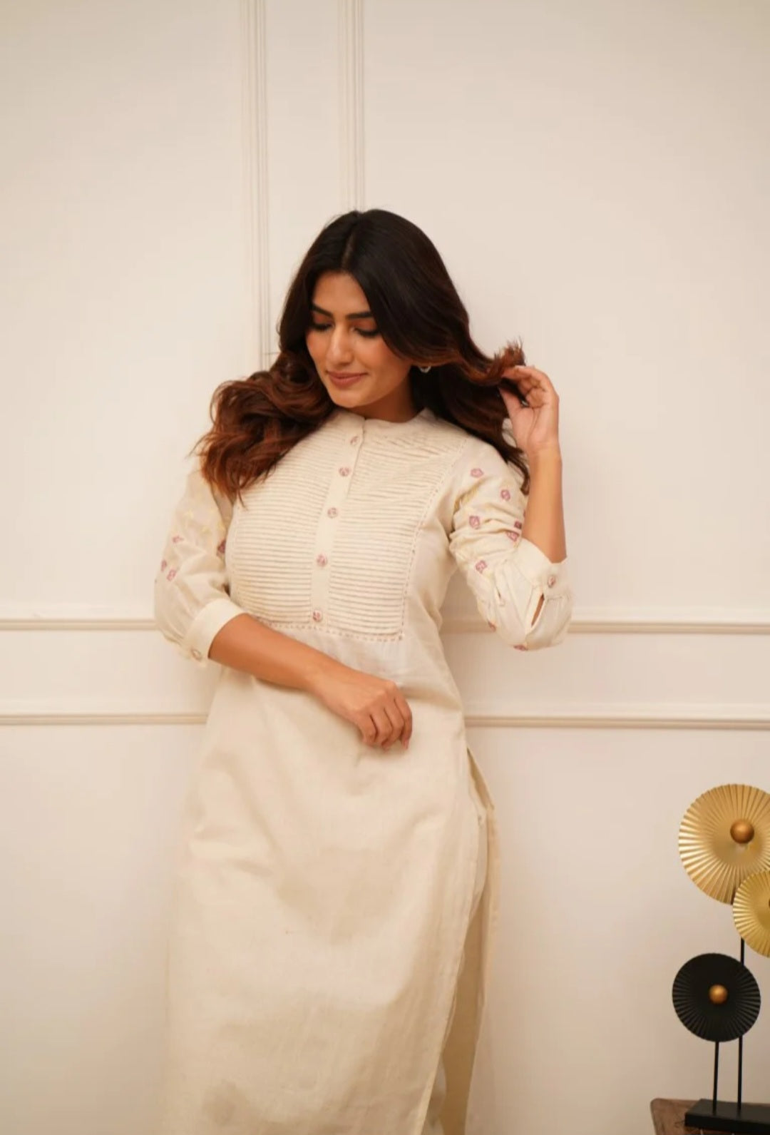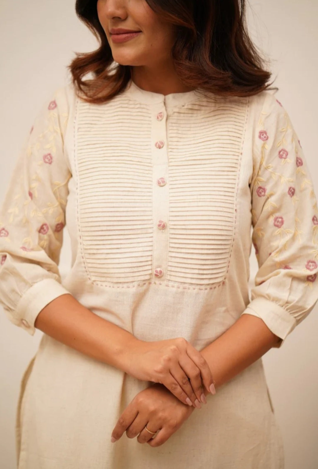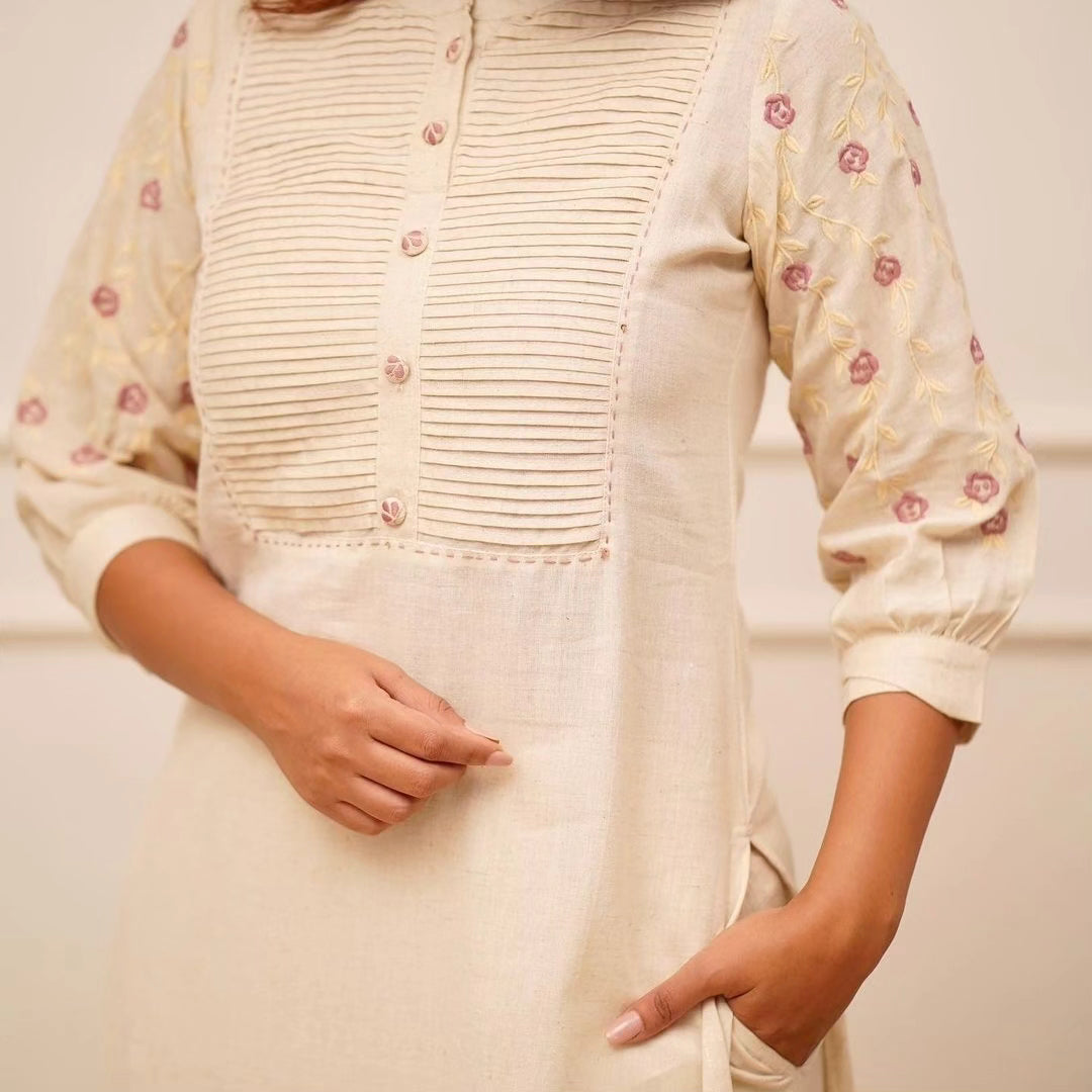 ● Solid Floral Resham Embroidered Pin-Tucks Kurta with Pants