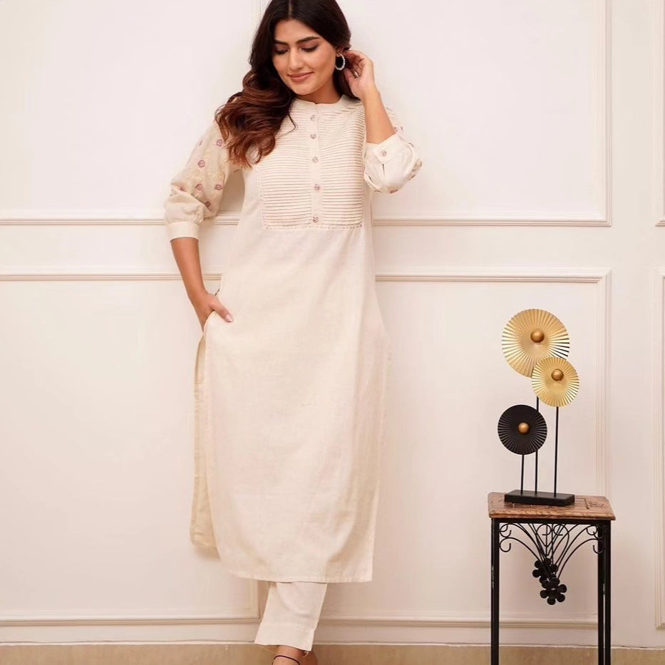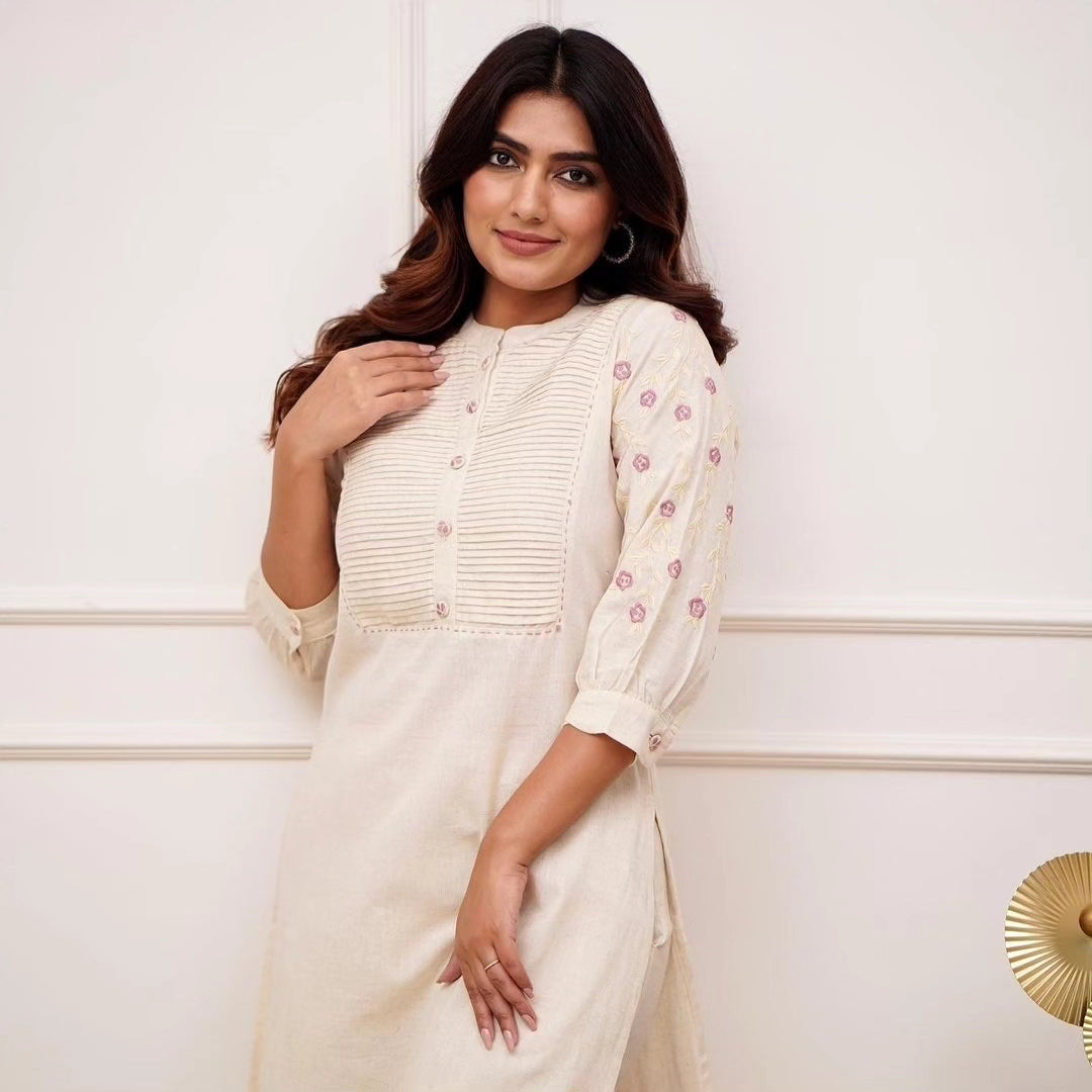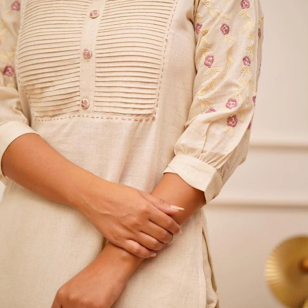 ● Solid Floral Resham Embroidered Pin-Tucks Kurta with Pants