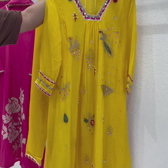 Radiate festive elegance with this Pure Mul Chanderi Suit, beautifully handcrafted for timeless charm. The vibrant mustard yellow hue is adorned with delicate mirror and thread embroidery, adding a touch of sparkle and sophistication.
