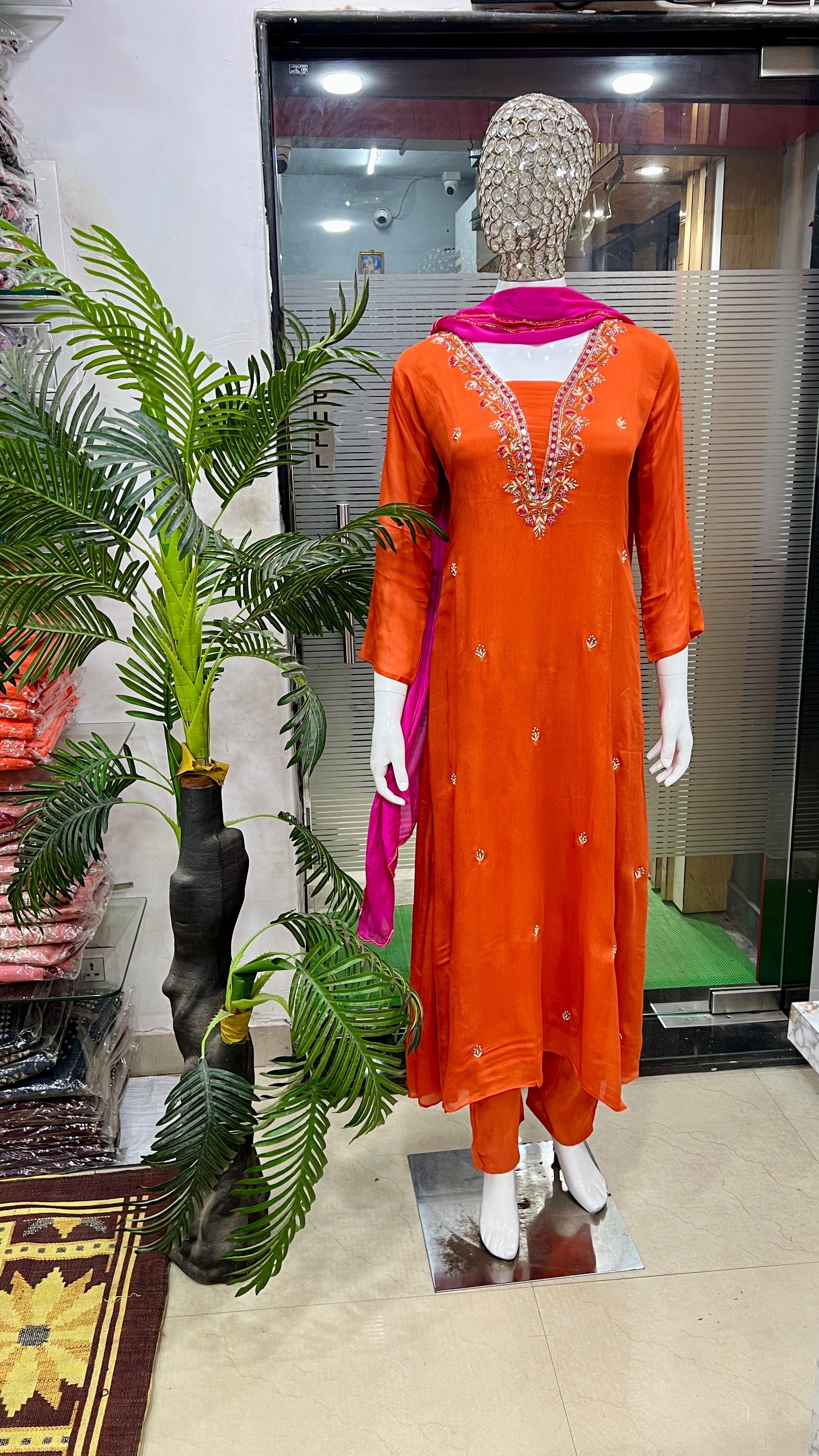 ✅ This ensemble ensures effortless grace and comfort. ✅ The intricate handwork adds a touch of regal charm, while the coordinated pants and dupatta complete the look with finesse.