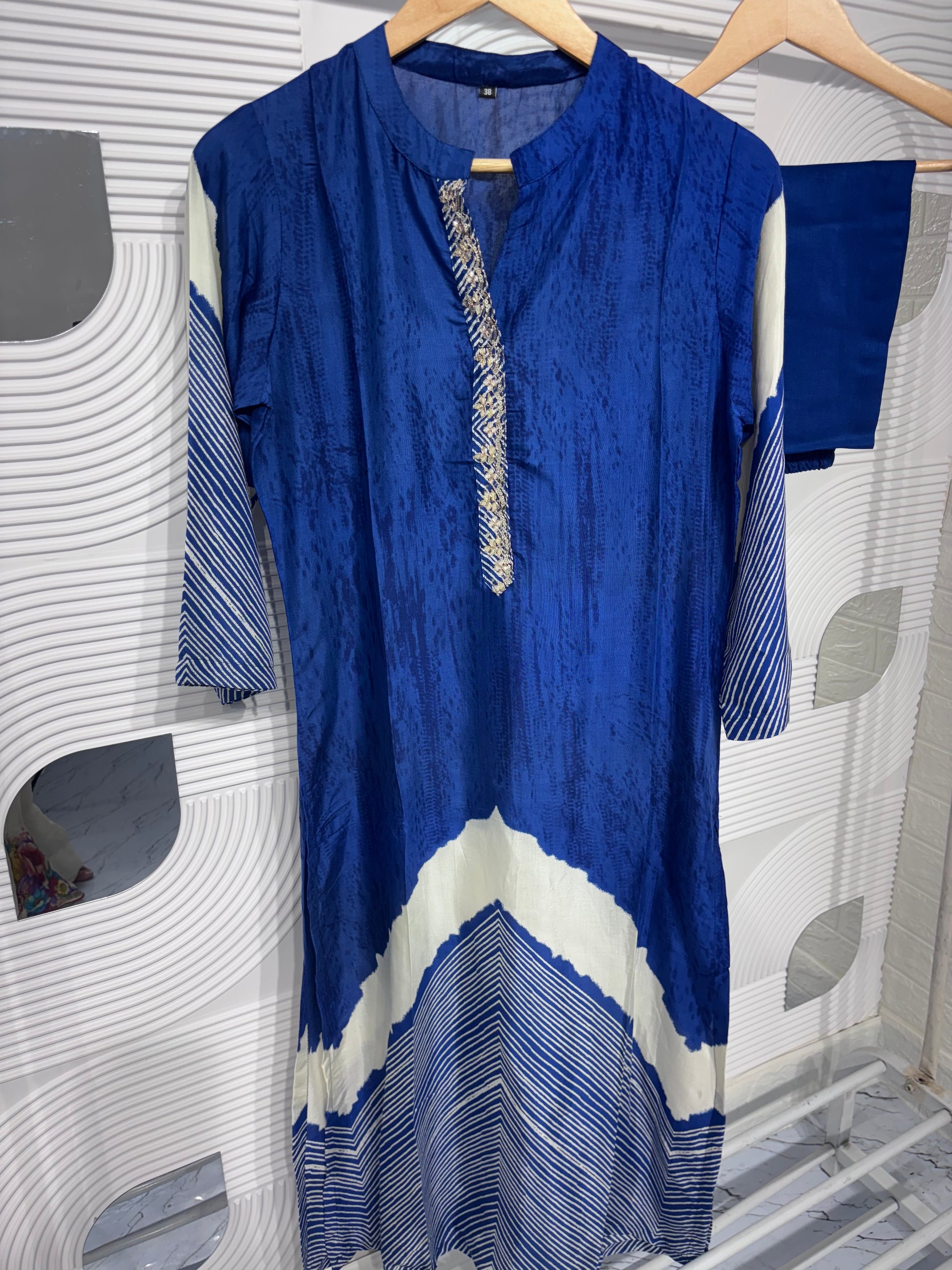 Made from premium-quality pure muslin, this outfit comes in a rich blue shade with a soft ivory contrast, giving it a vibrant yet graceful appeal. Muslin fabric is known for its breathable texture and lightweight comfort, making it perfect for all-day wear.