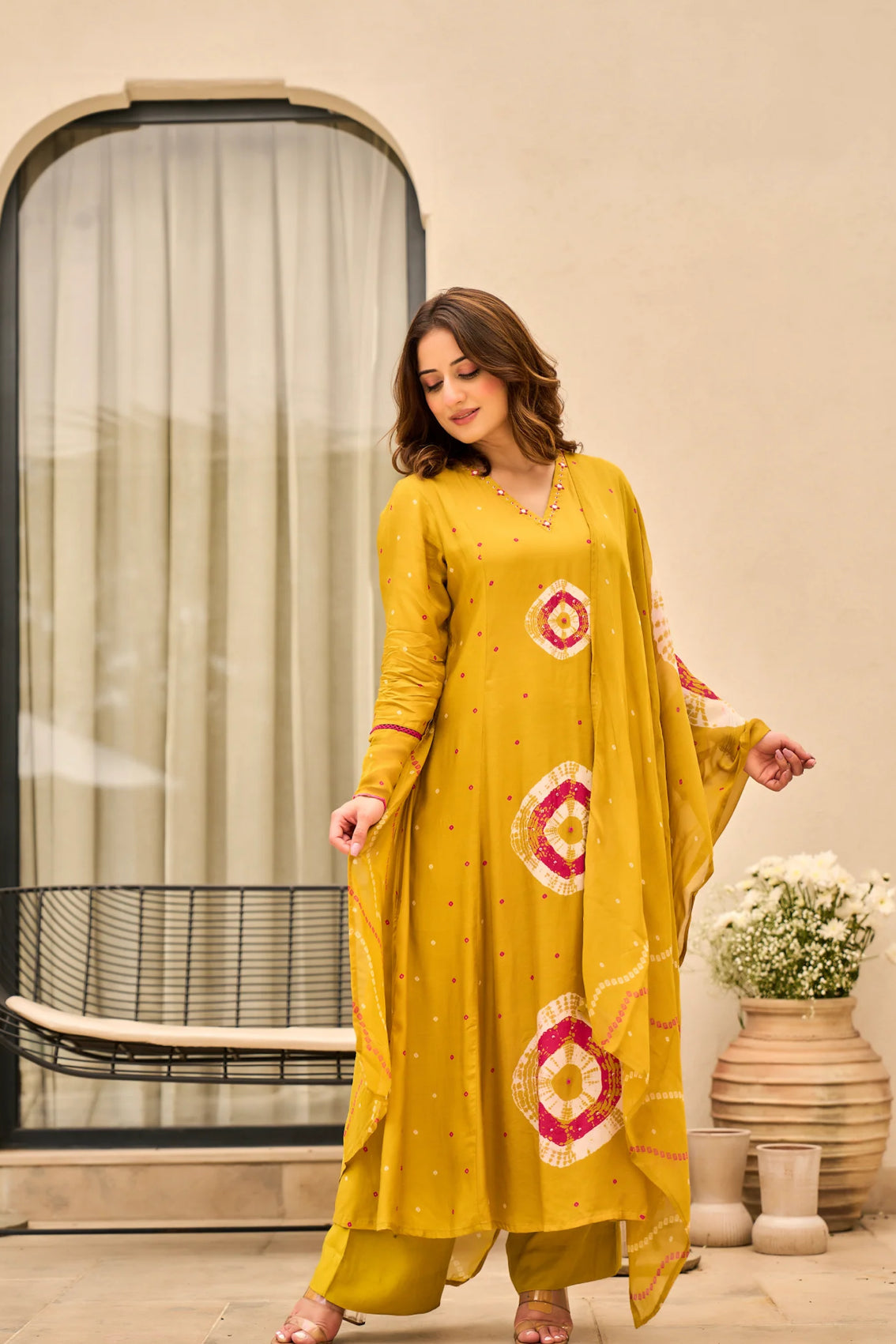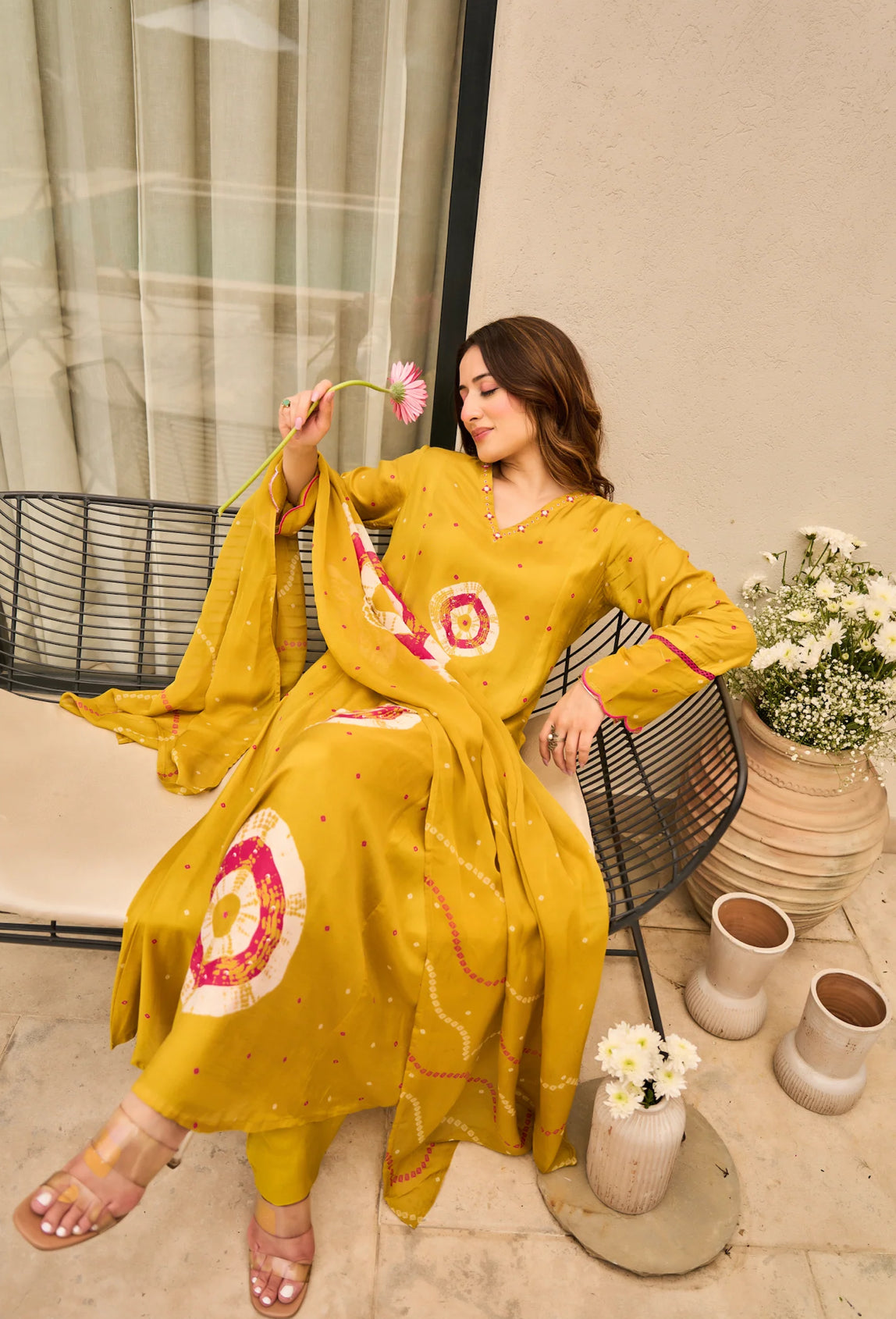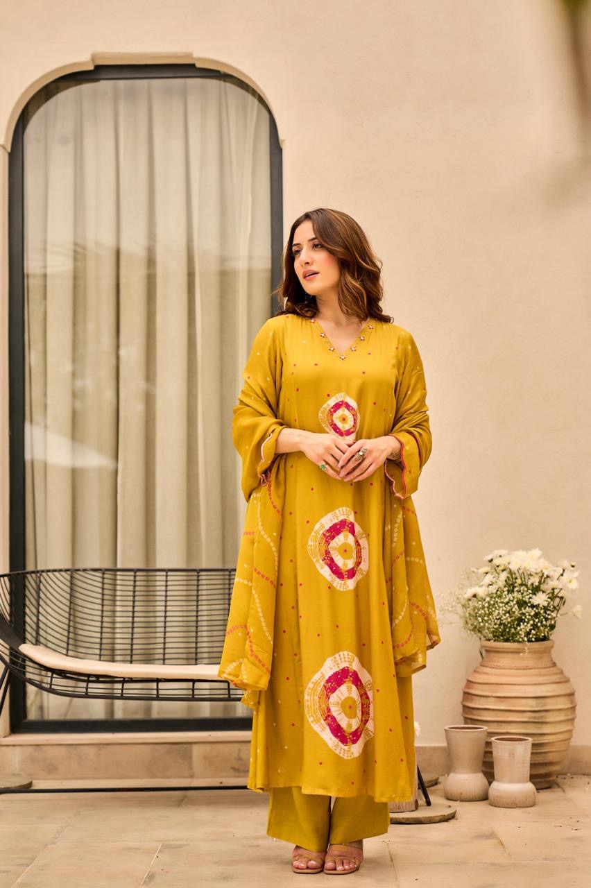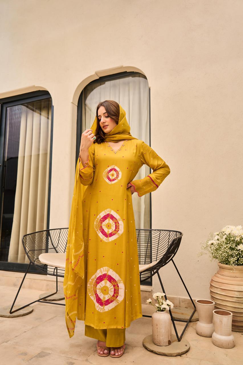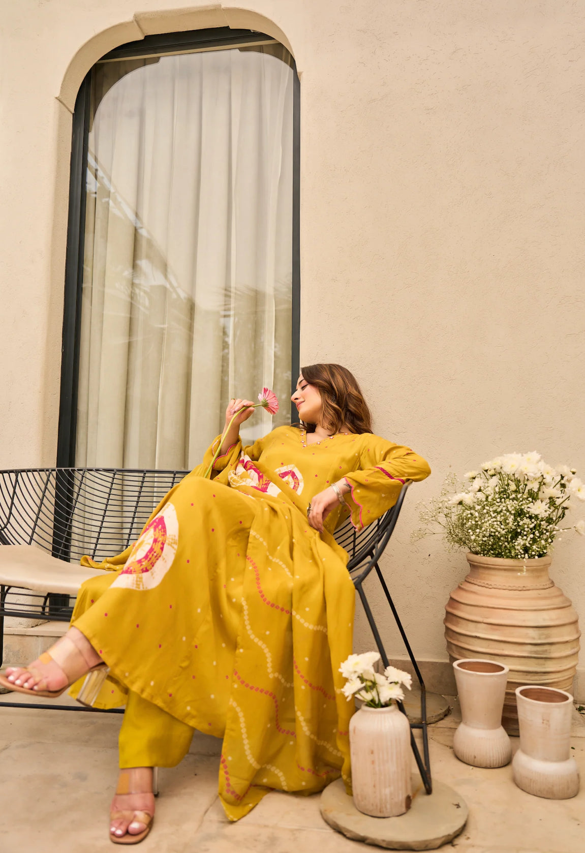 • Color: Mustard Yellow with delicate bandhani-inspired handwork and contrast detailing in pink & white.