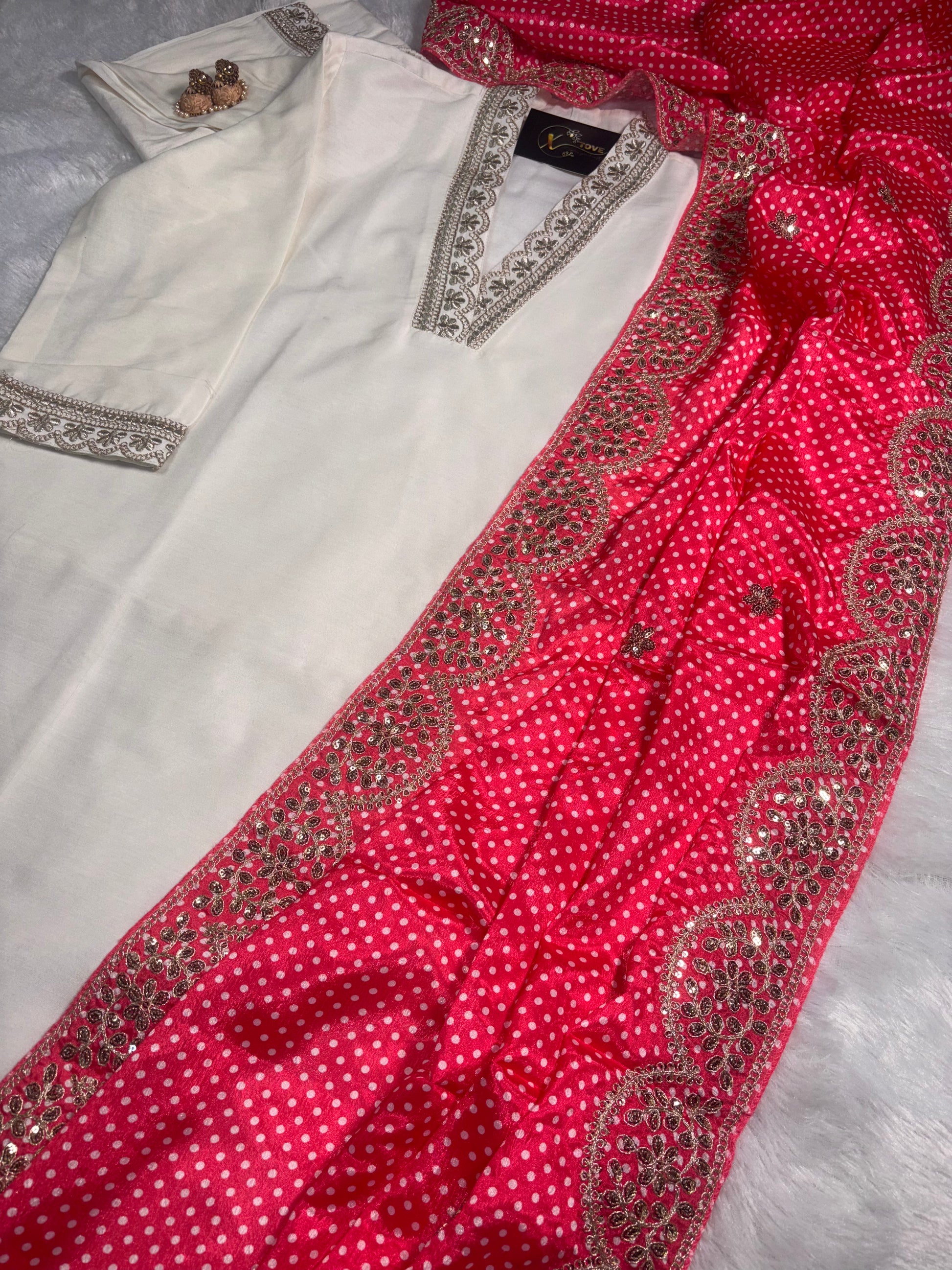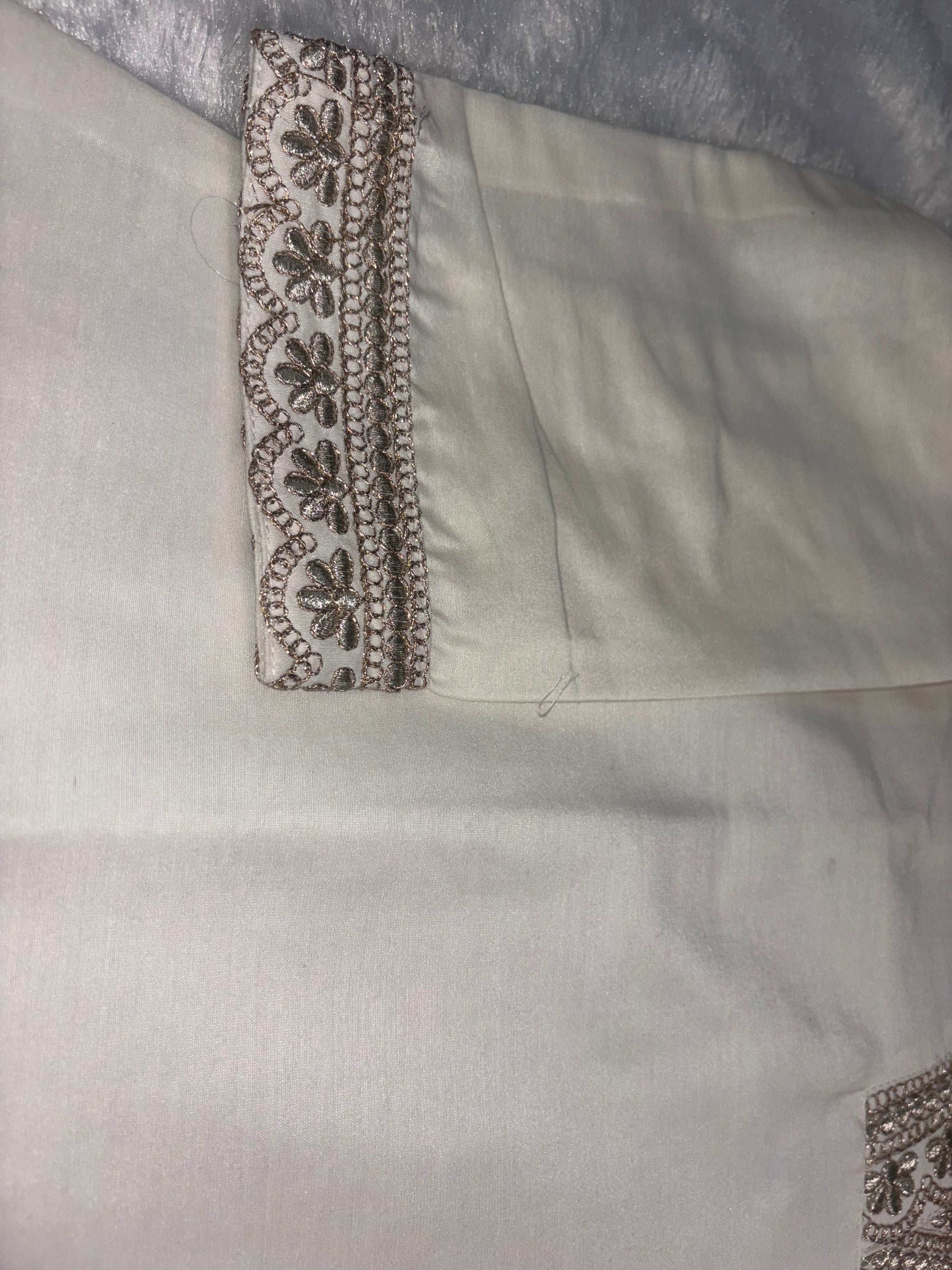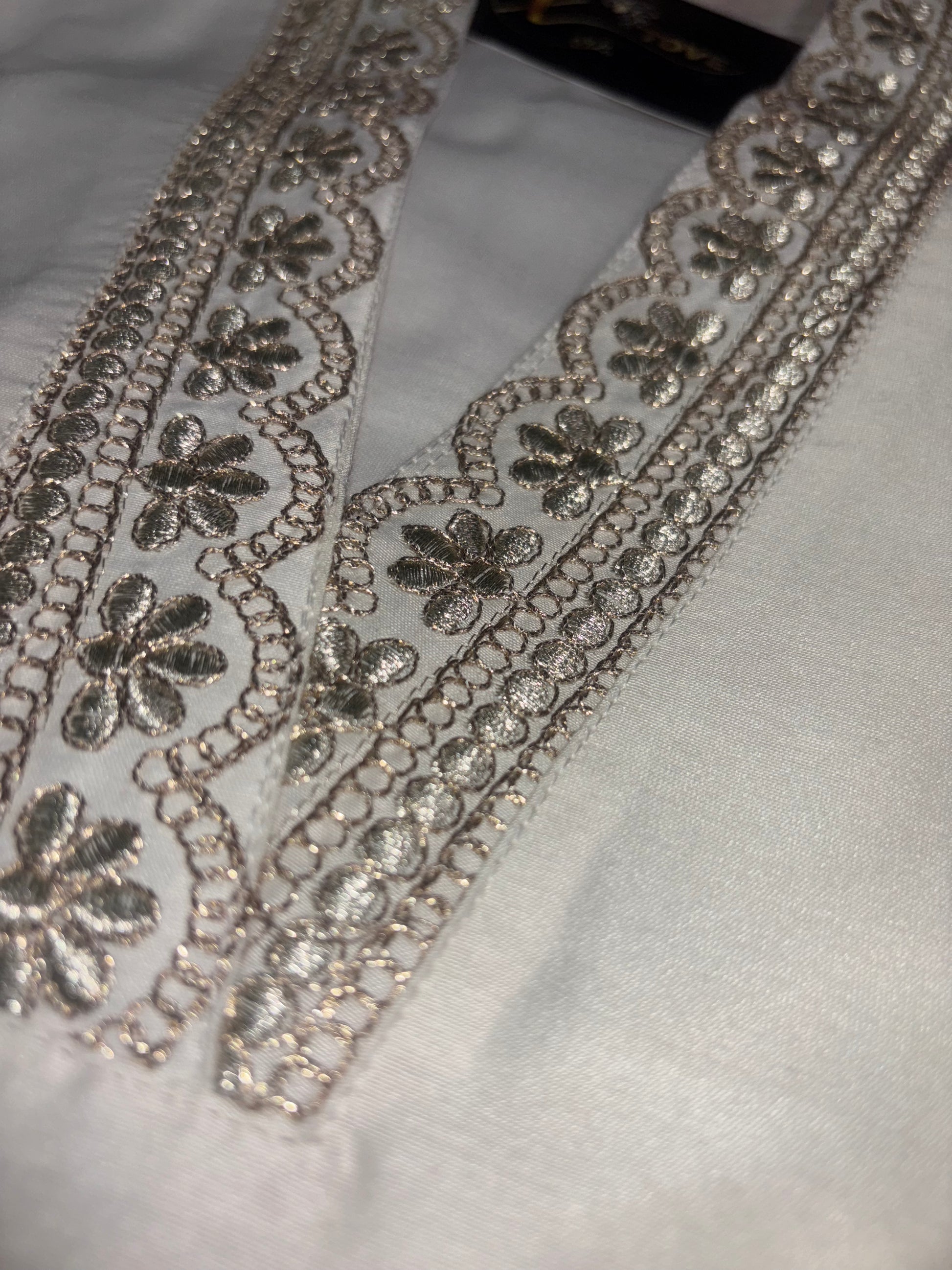✅ It features stunning zari embroidery on the neckline, sleeves, ghera, and bottom.