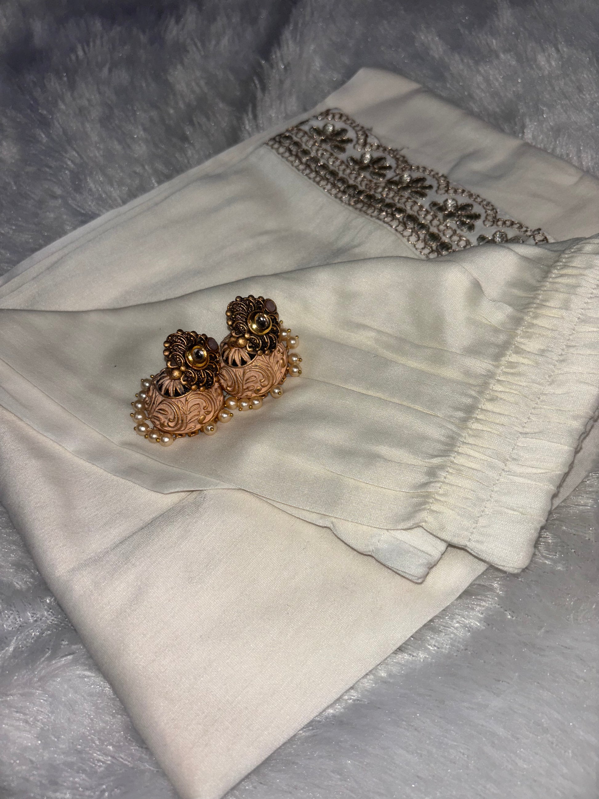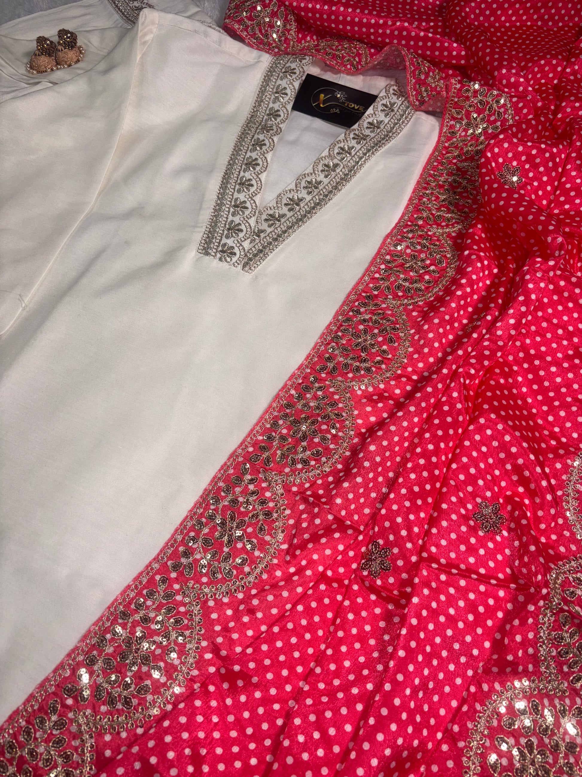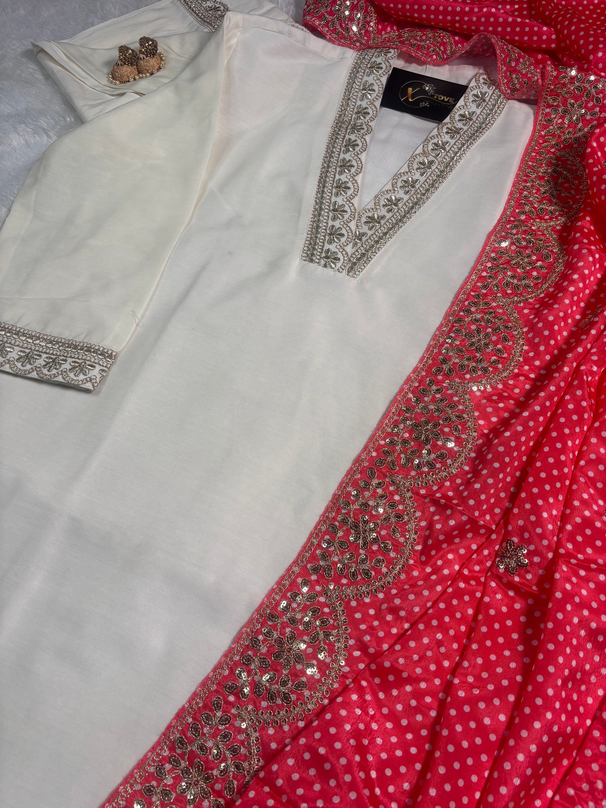 ✅ It features stunning zari embroidery on the neckline, sleeves, ghera, and bottom.