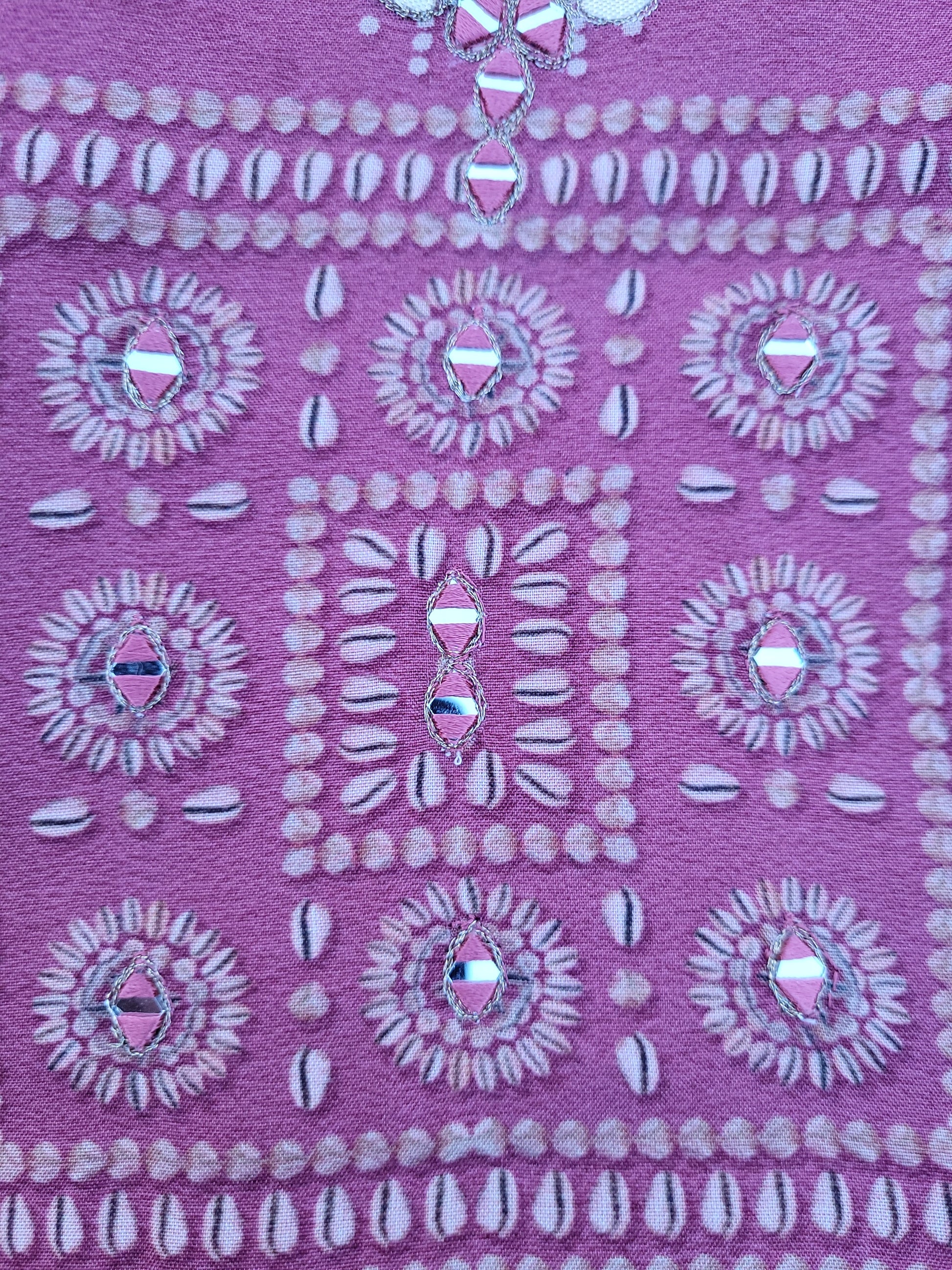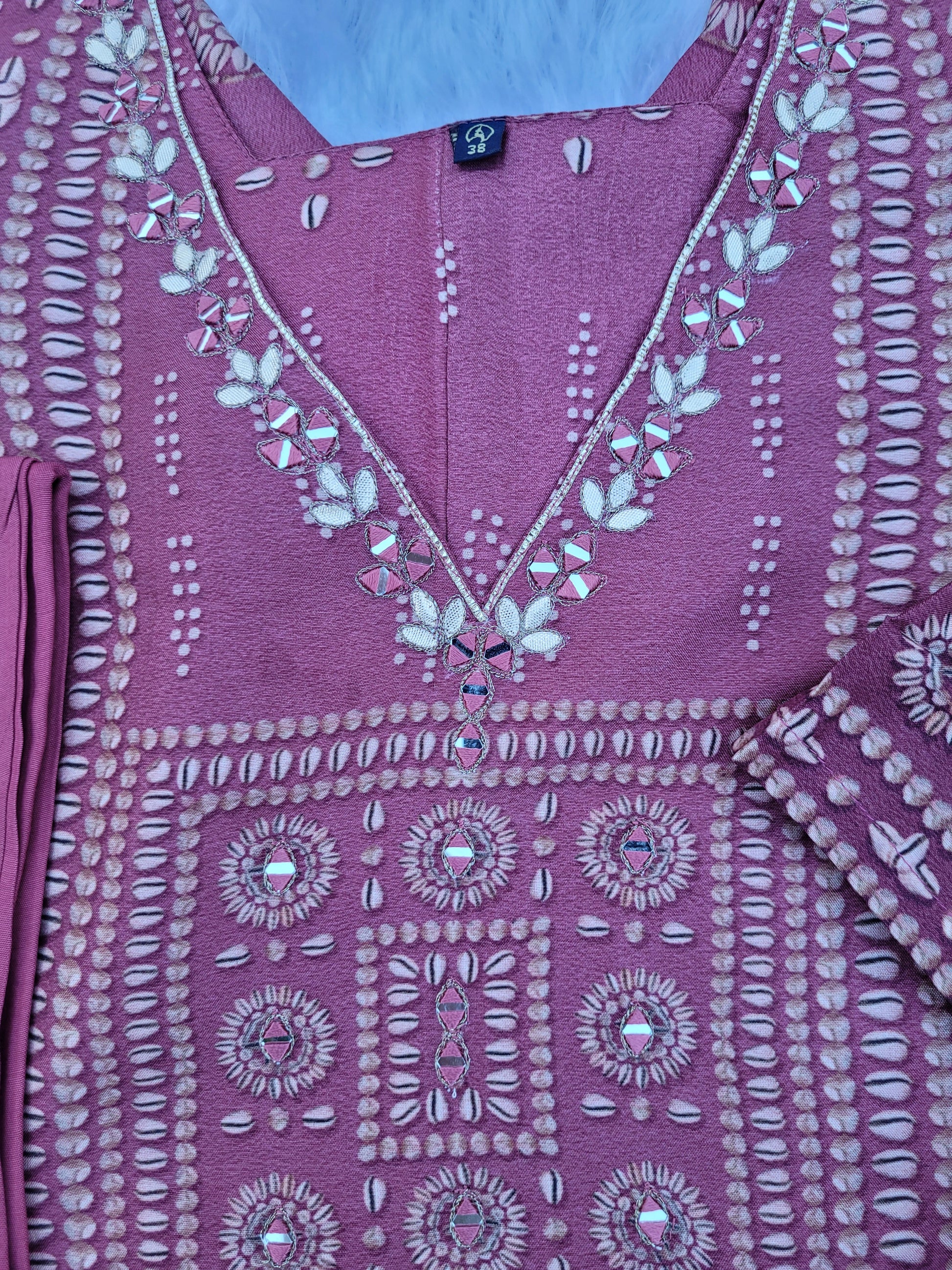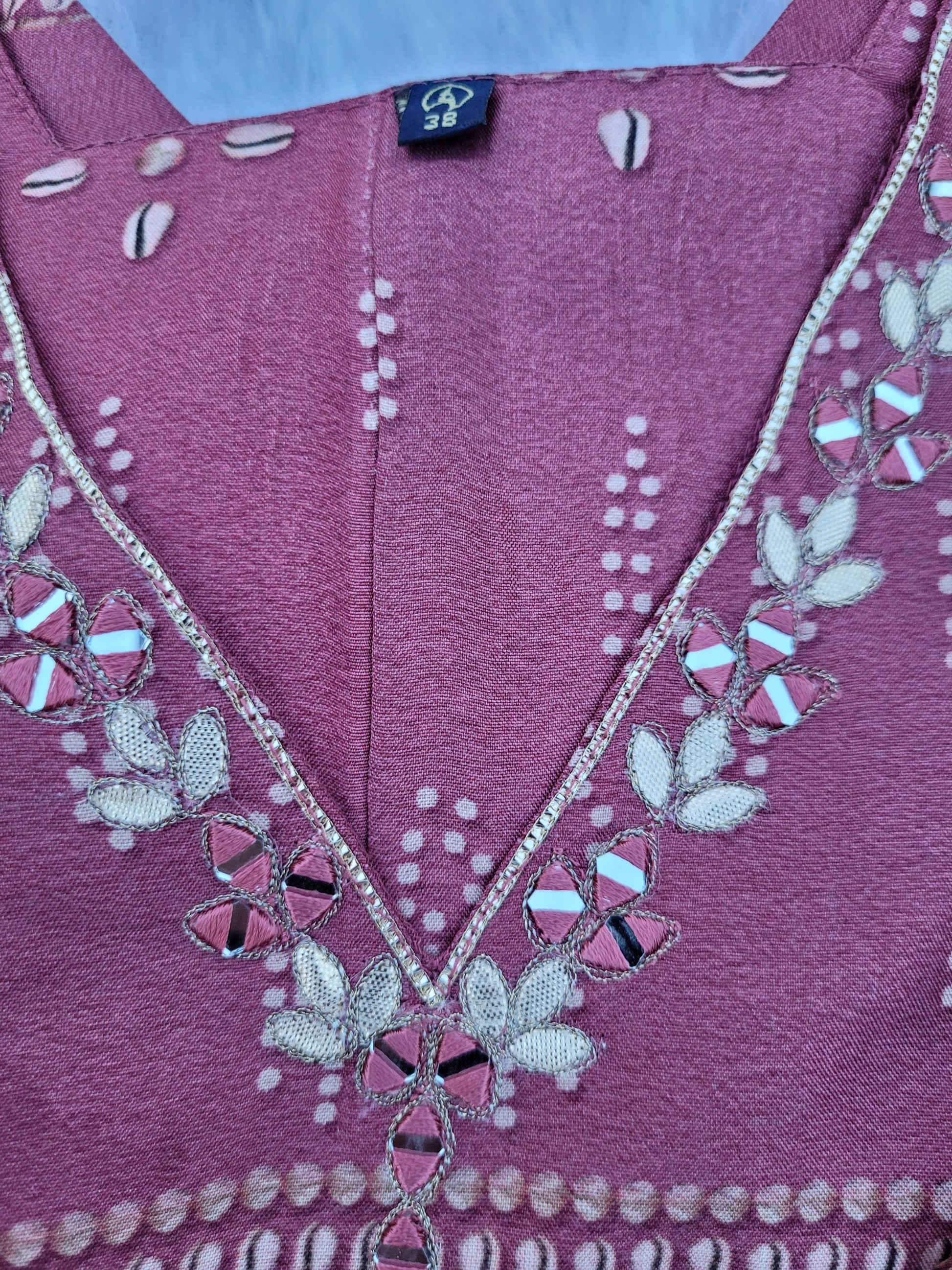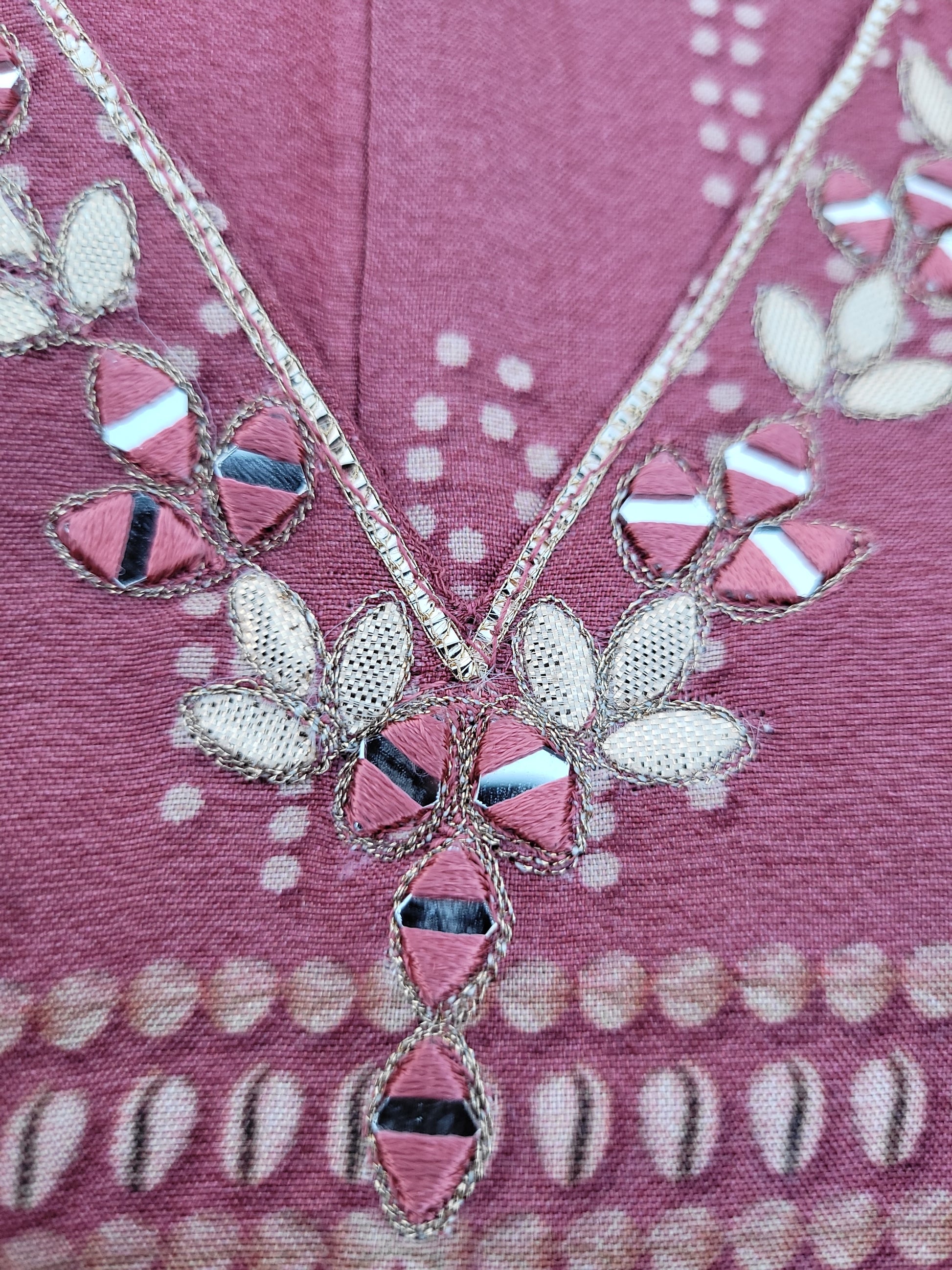 🩷 Exquisitely detailed handwork on the neckline adds a touch of elegance with the use of mirror, gotapatti, and rose golden thread.
