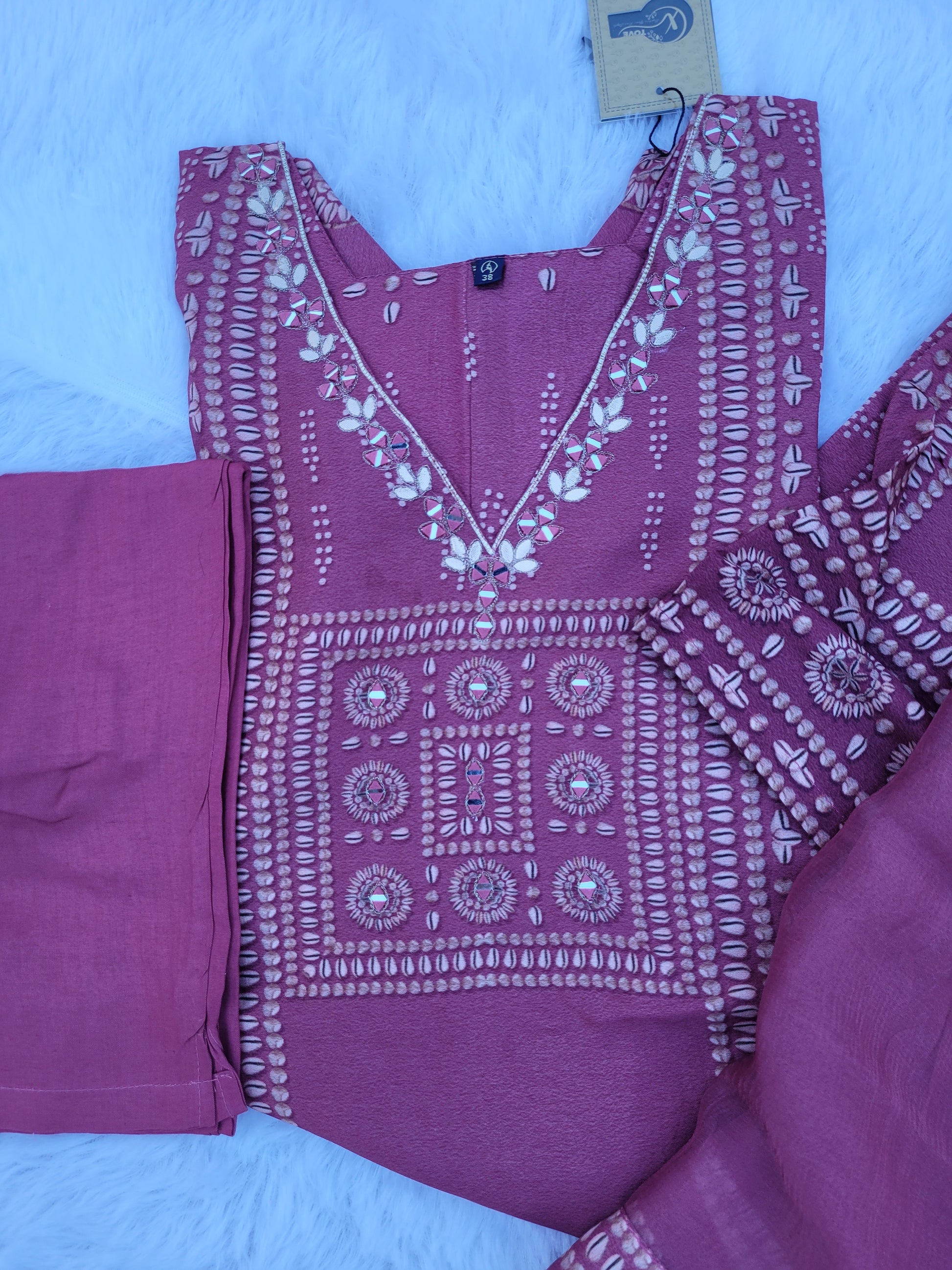 🩷 This Muslin three-piece suit boasts a luxurious pure fabric and lined kurta for added comfort.