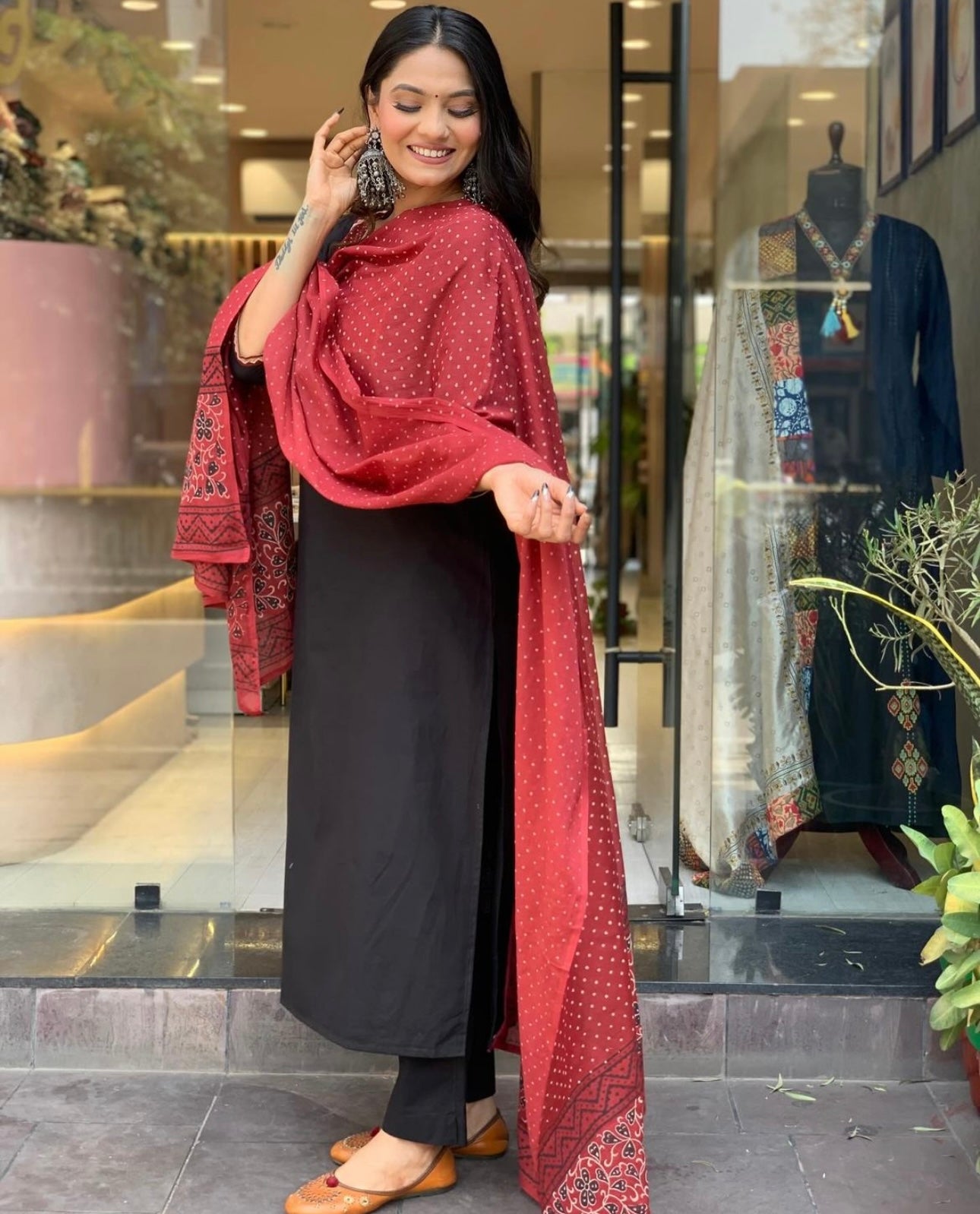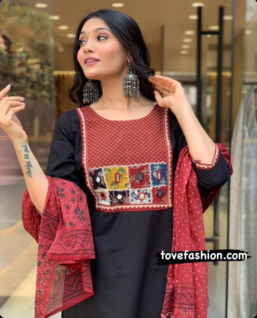♟️The cotton printed dupatta and plazzo, along with the back Kalamkari printed patch, complete the outfit.