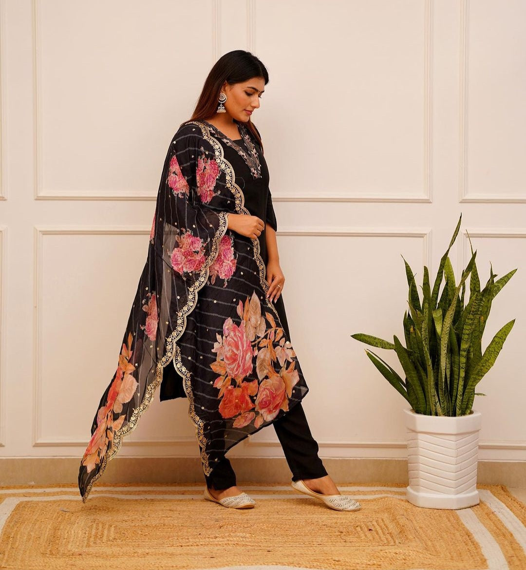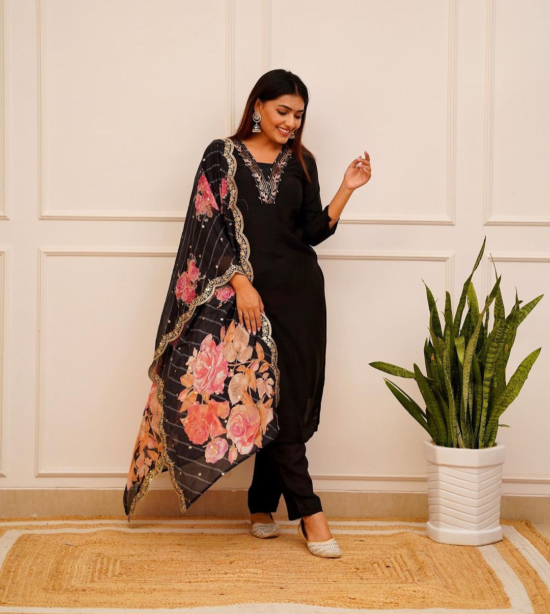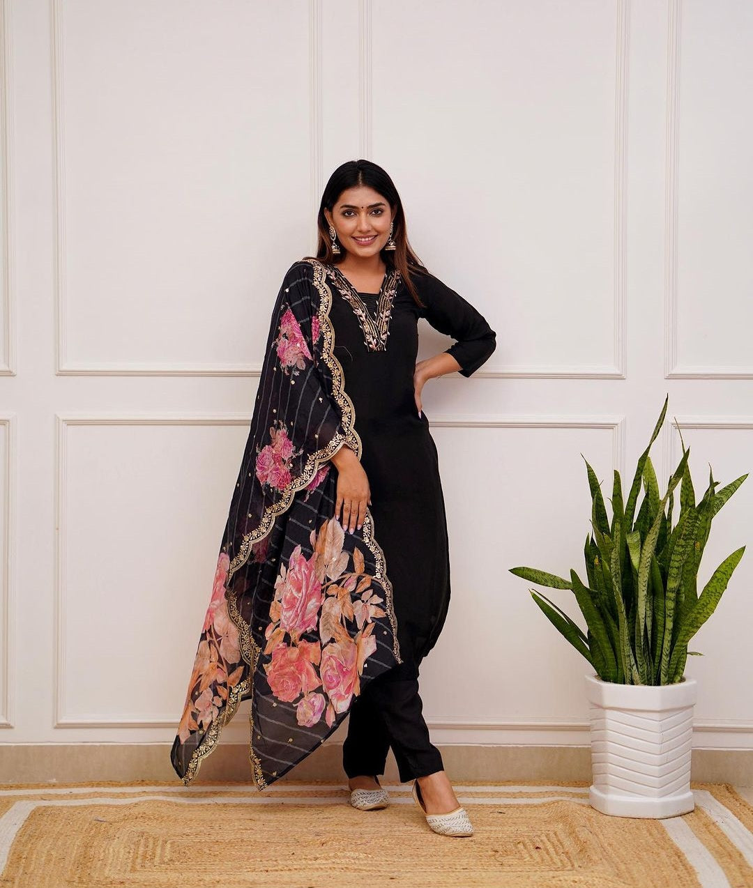 πŸ’–πŸ’– This party wear suit features beautiful embroidery on the neckline with a stunning colour combination.