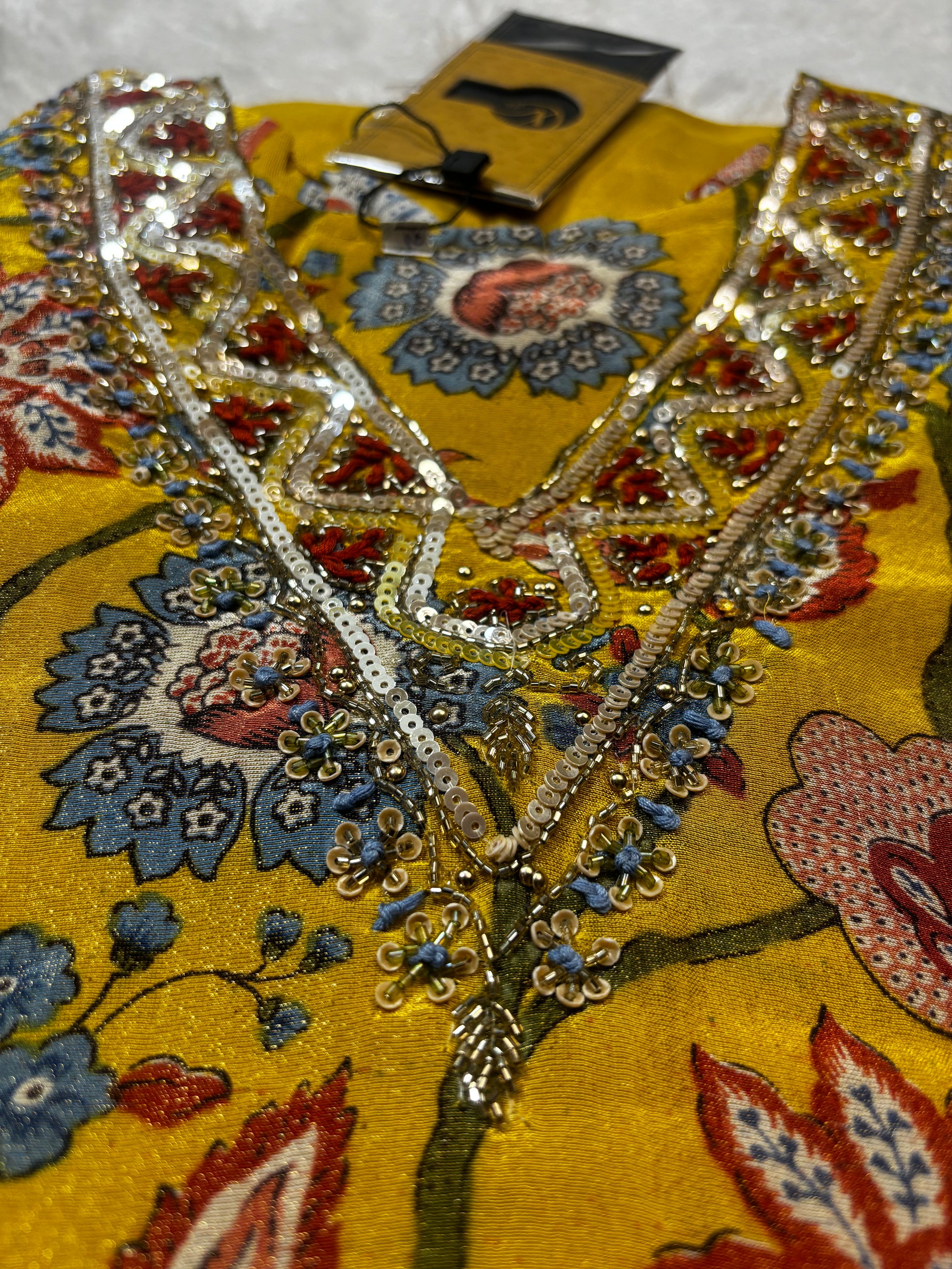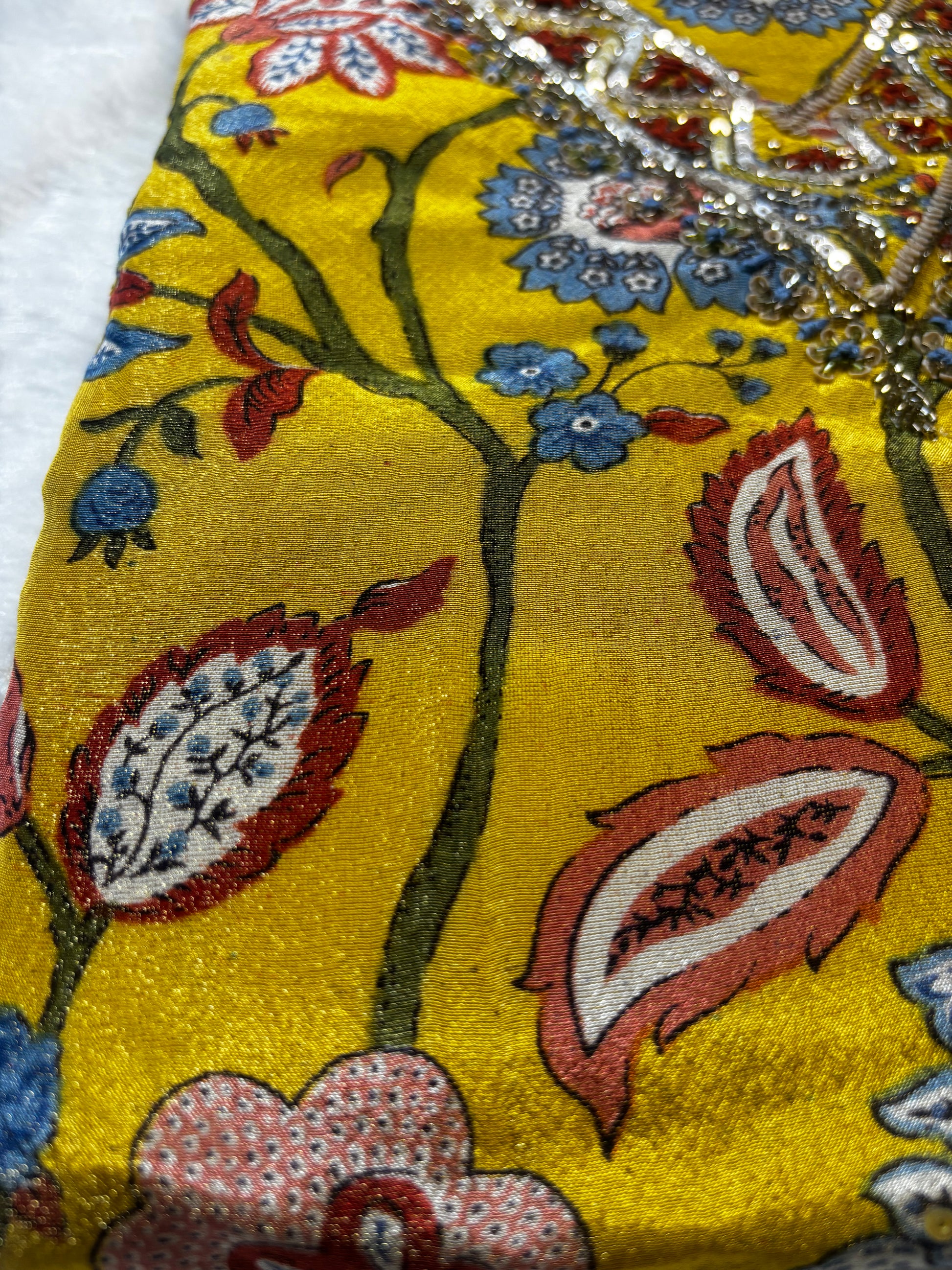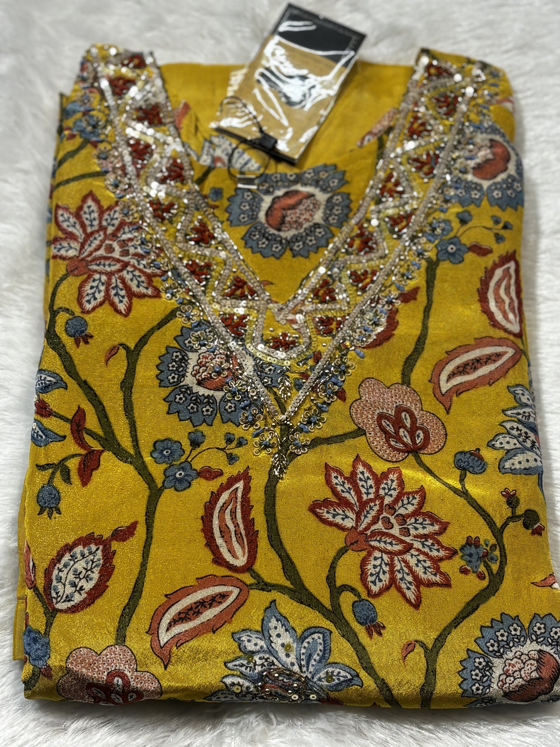 Soft Shimmer Tissue Suit..Adorned with Intricate Embroidery in Stunning Mustard Yellow Colour
