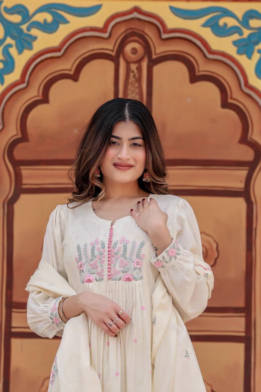 Crafted from soft and breathable mul cotton, this three-piece suit offers a perfect blend of comfort and elegance. The beautifully embroidered kurta is thoughtfully lined for a smooth fit, ensuring all-day ease. Paired with straight pants and a lightweight mul cotton dupatta, this ensemble is ideal for both casual gatherings and festive occasions.